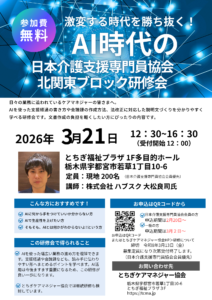 主な内容:(実演)ケアマネジャー向け生成AI実践活用セミナー(活用に向けての注意事項、活用のポイント)